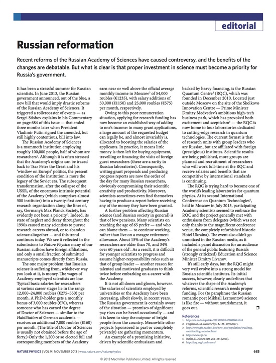 Nature Physics magazine wrote a story on The Russian Quantum Center, a Skolkovo Quantum Physics resident. The magazine also looked into controversy of the recent reforms of the Russian Academy of Science.