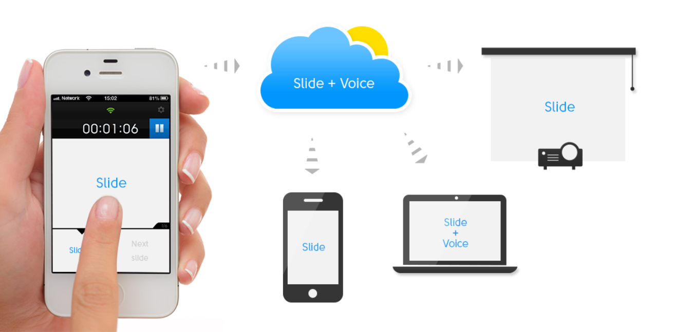 Мобильное приложение используется докладчиками во время презентации и позволяет переключать слайды на проекторе, транслировать выступление онлайн и записать его в формате голоса наложенного на слайды.
